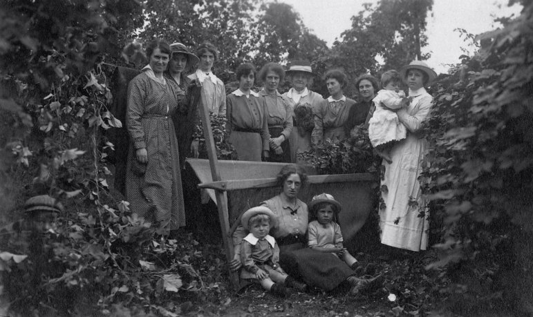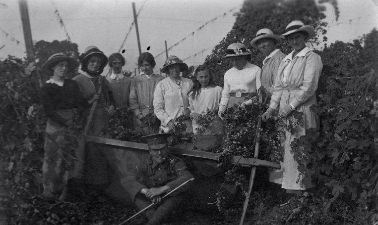 Harvesting during WW1. Written alongside "Wartime Volunteers hop pickers about 1917". From Cook Family Collection.