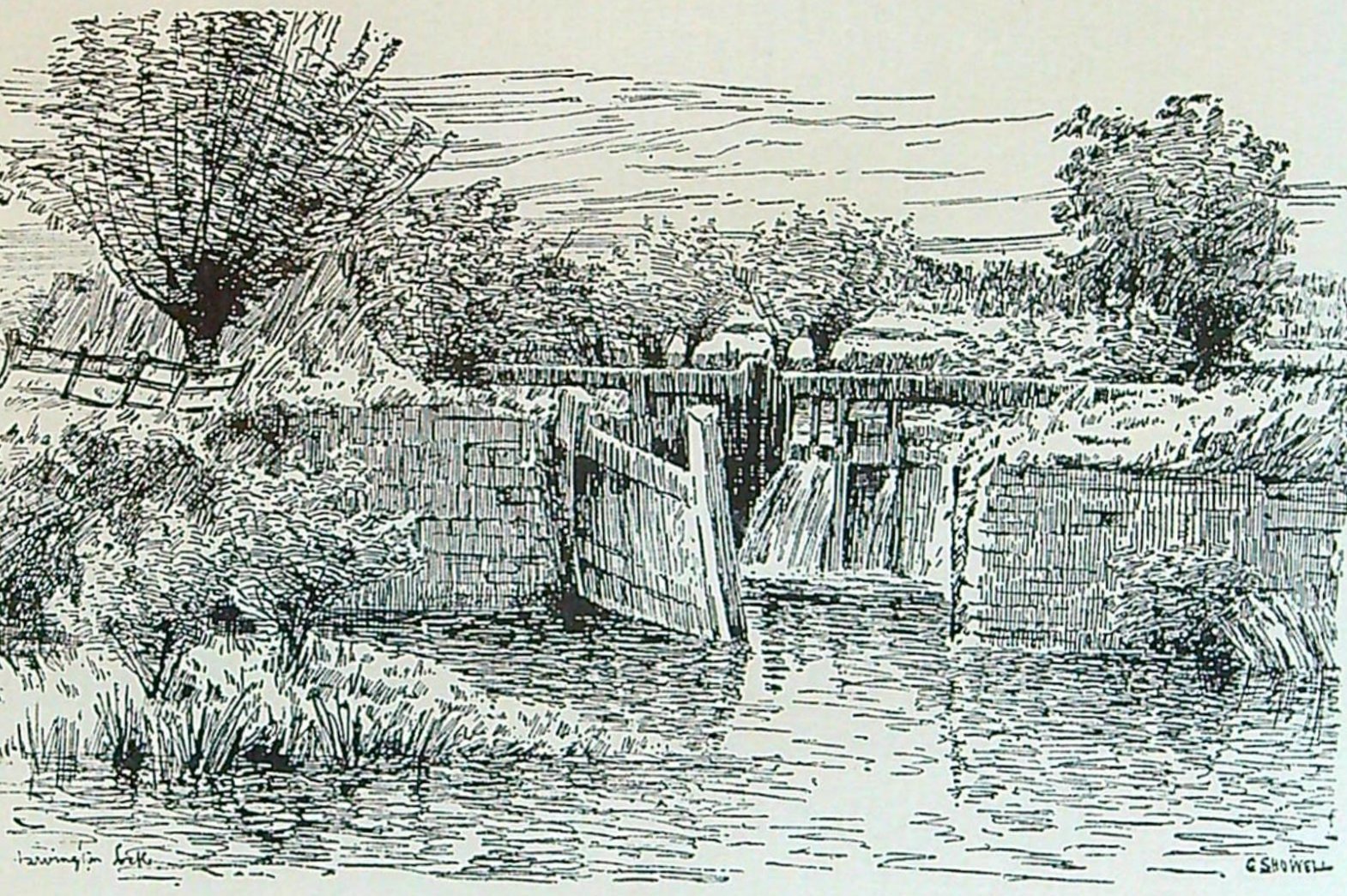 Sketch dated to before 1855 looking up Church Street and showing the old property demolished in the 1930's on the right and Crooked Walls on the left. The sketch shews the church tower prior to its spire erected in 1855. The sketch was copied from an old book by the late Steve Cook and a copy was given to Joy Davies.