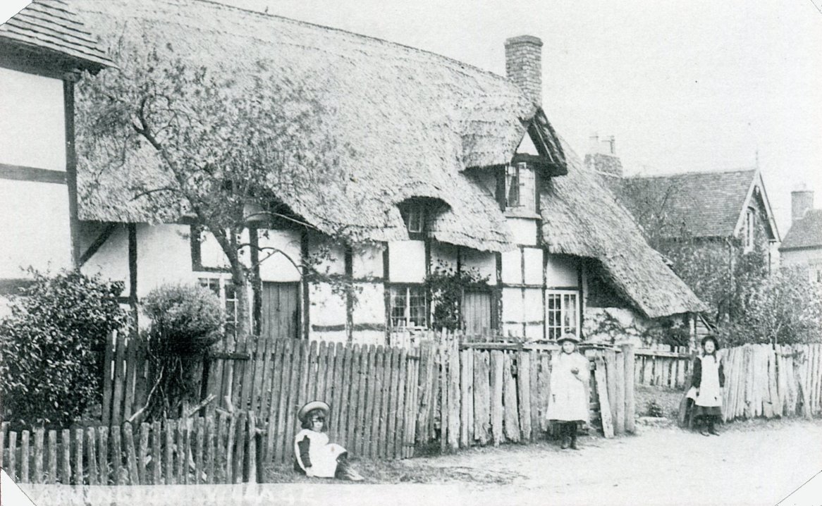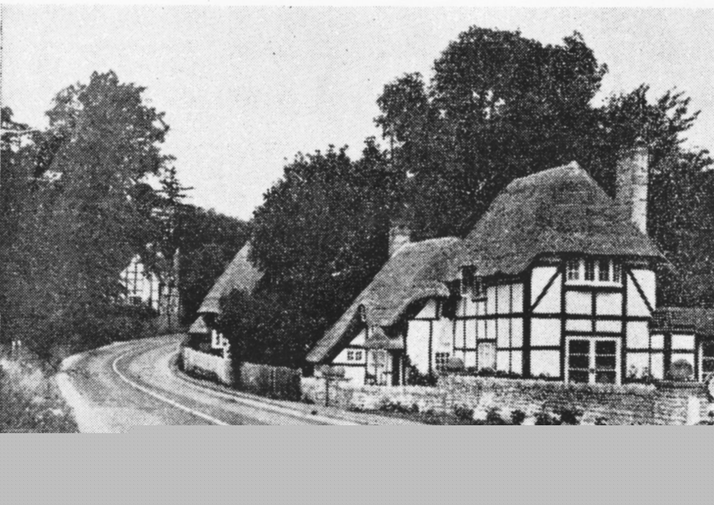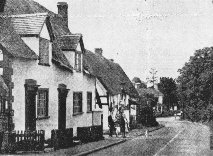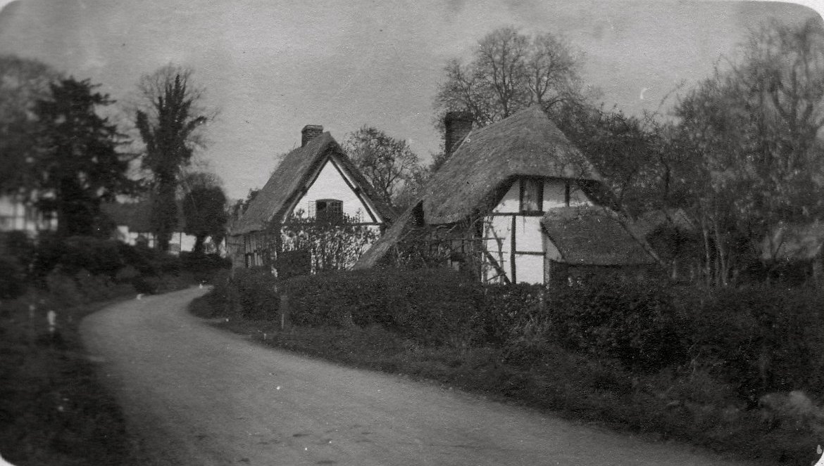 Copy of a postcard looking down Stratford Road with the two old properties, demolished in the 1930's. Written to the side is: "Cottages now demolished Hopkiln Cottages now built there". From Cook Family collection.
