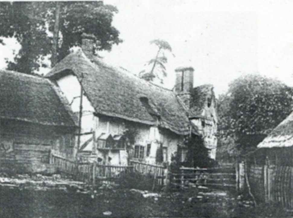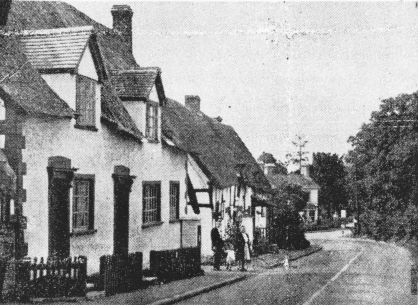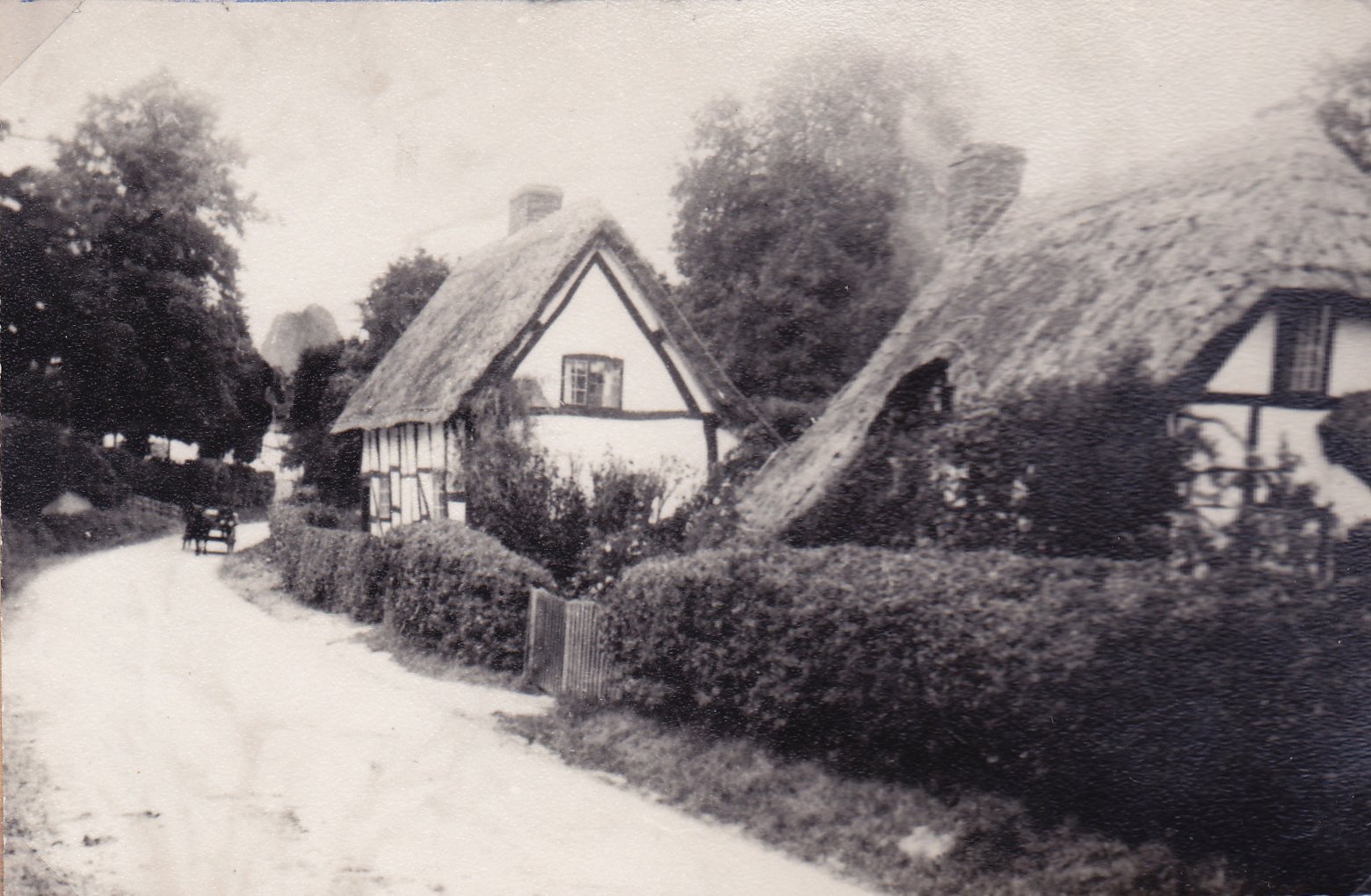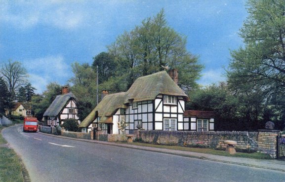 Copy of a postcard looking down Stratford Road with the two old properties, demolished in the 1930's. Written to the side is: "Cottages now demolished Hopkiln Cottages now built there". From Cook Family collection.