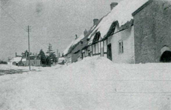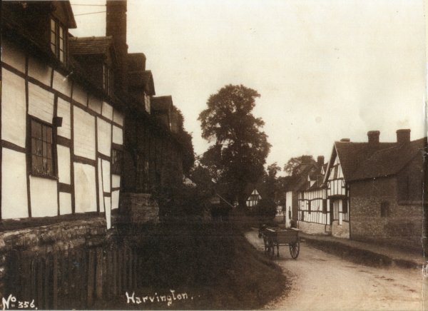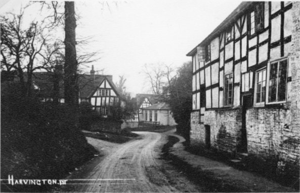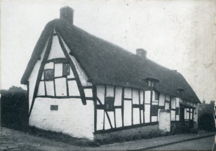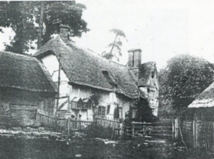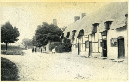Postcard dating from about 1900. Looking down Stratford Road with the two old properties and smithy, demolished in the 1930's, on the left and the still existing properties on the right. Note the cruck frame on the extreme left. Photograph is from The Vale of Evesham by Josephine Jeremiah.