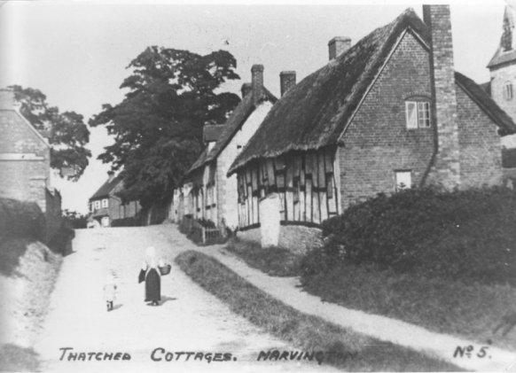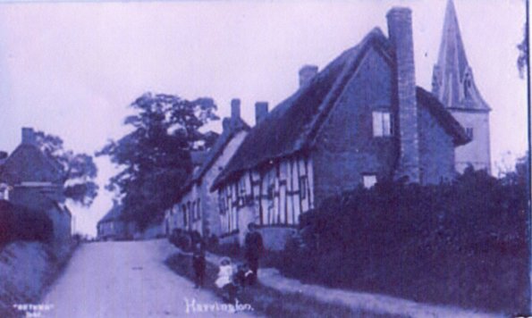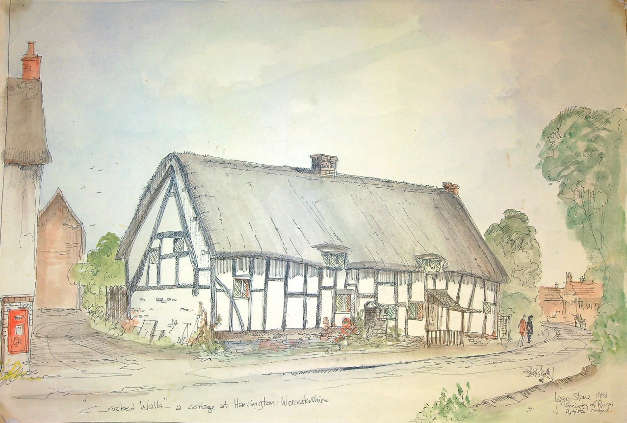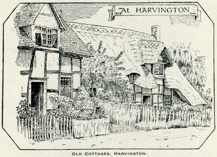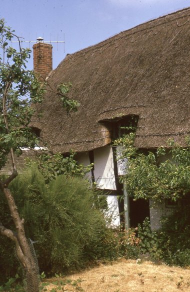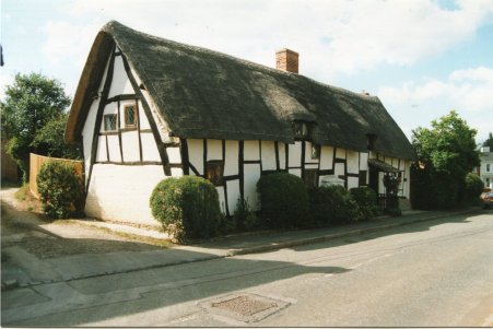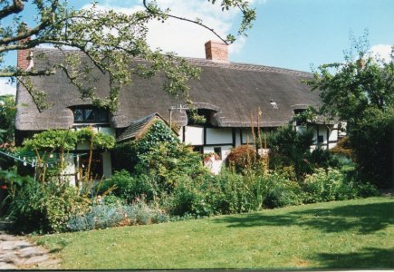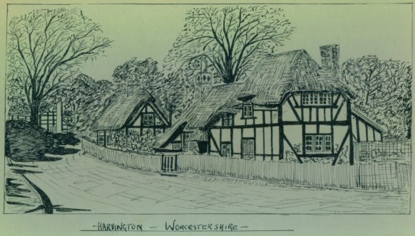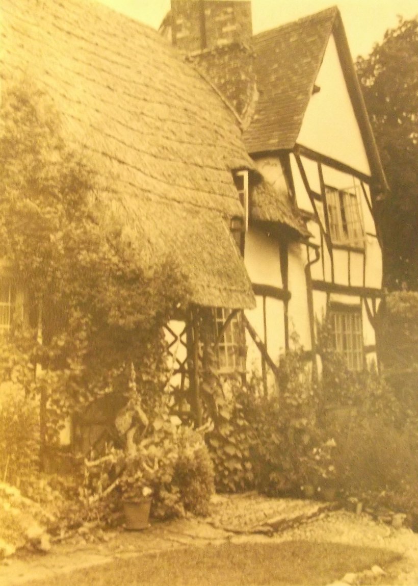 This is a painting of Thatchways, the first cottage on the right as one enters Harvington from Norton. Note that it does not have the timber-framed extension. The picture was copied from a book called Rural England by P H Ditchfield, titled 'Lilac and Apple Blossoms, Harvington, Worcester, the artist was A R Quinton'. Written alongside the painting is "Thatchways Cottage by A R Quinton 1900". Another copy is to be found in a little cookery book titled Favourite Country Soups. From the Cook Family collection.