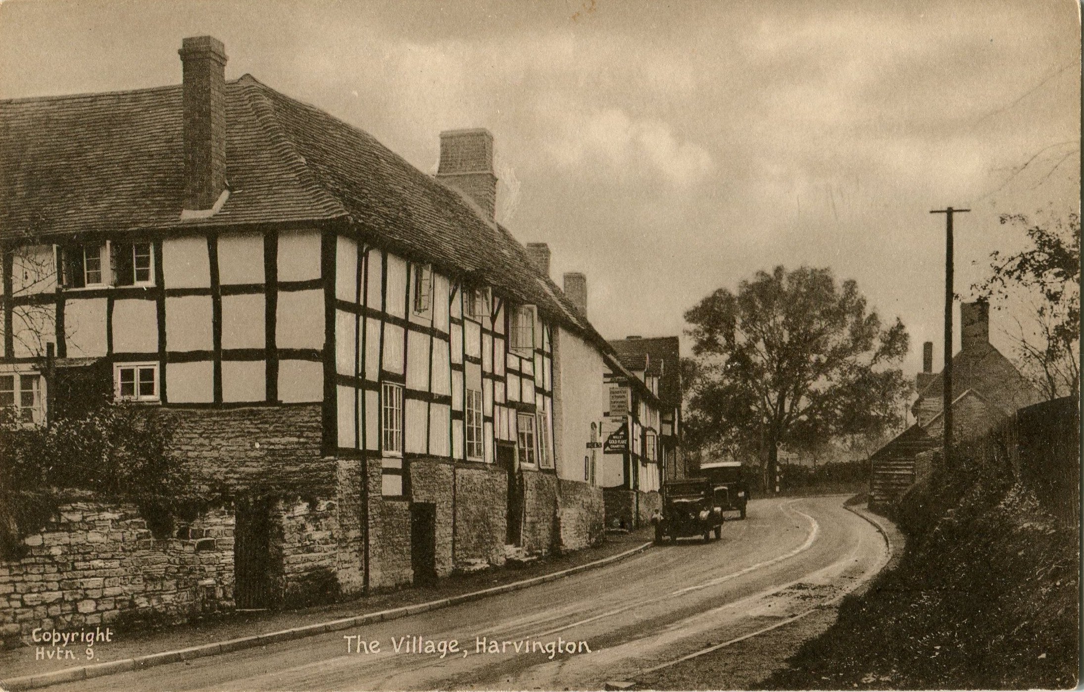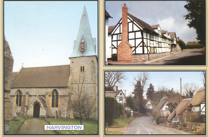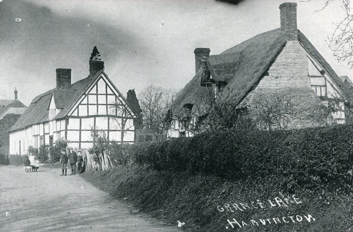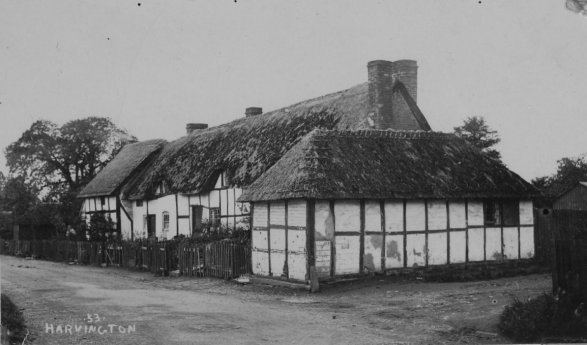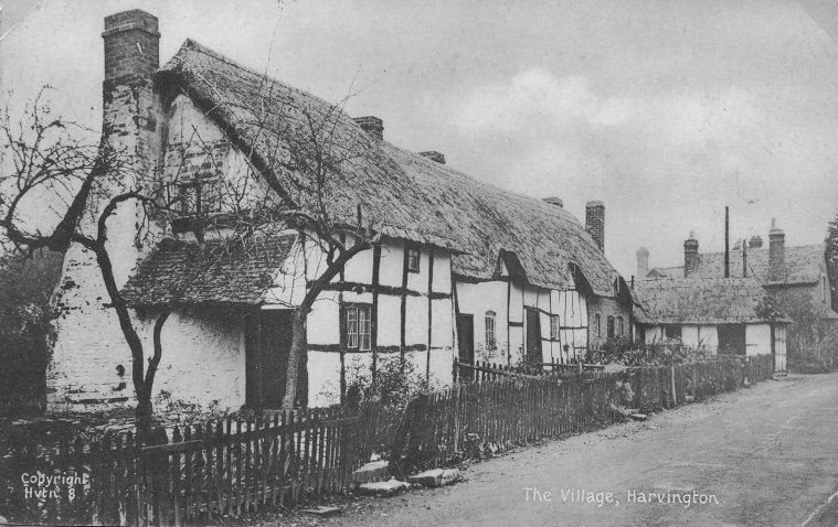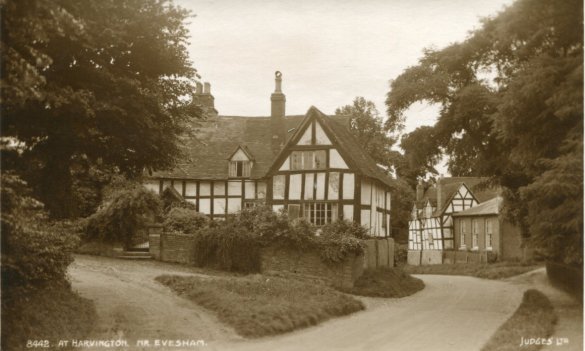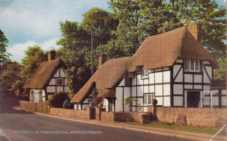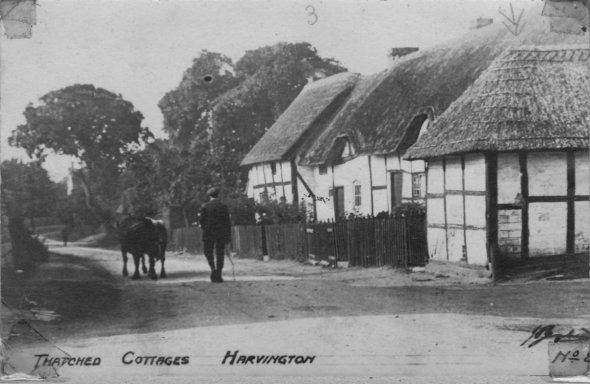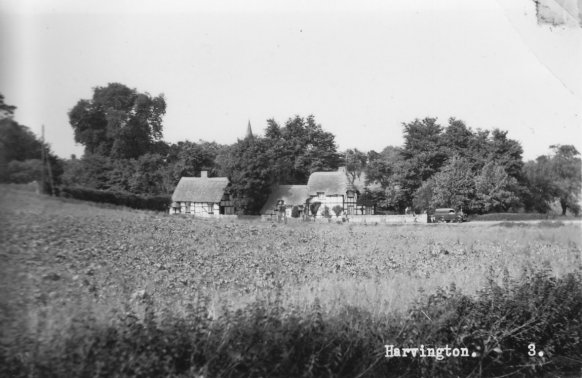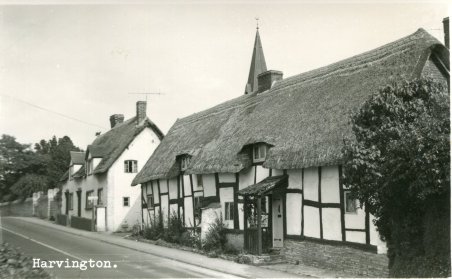 Postcard dated from the early 1930's. The card depicts the first two houses (Thatchways & Thatchholm) on the right upon entering Harvington from Norton. Note that Thatchways has its extension. The timbers on the end gable are now arranged differently.