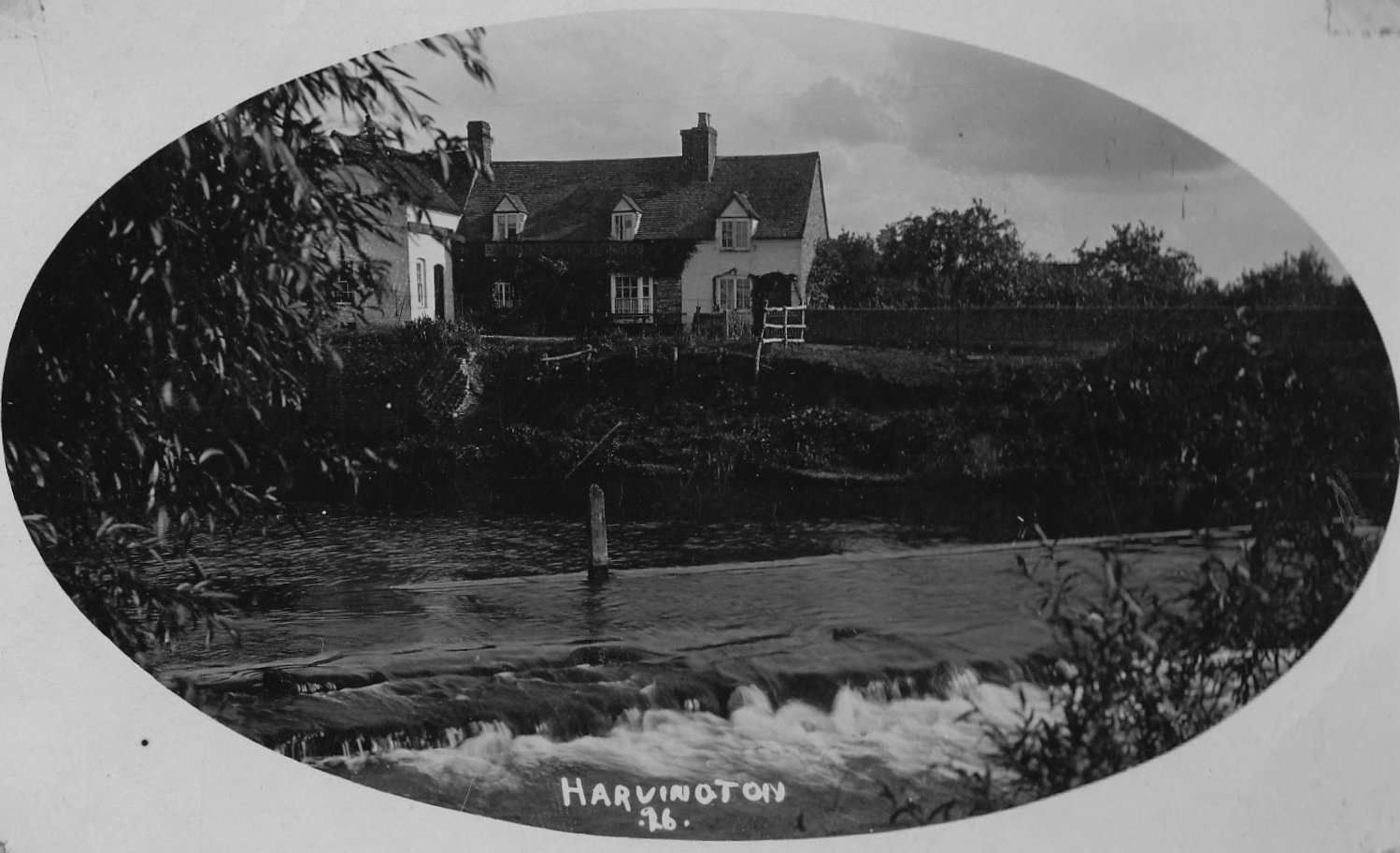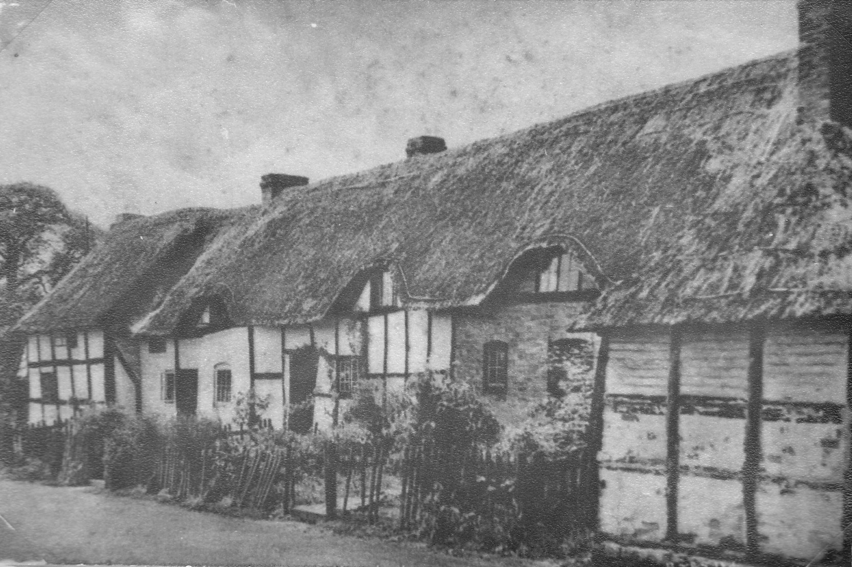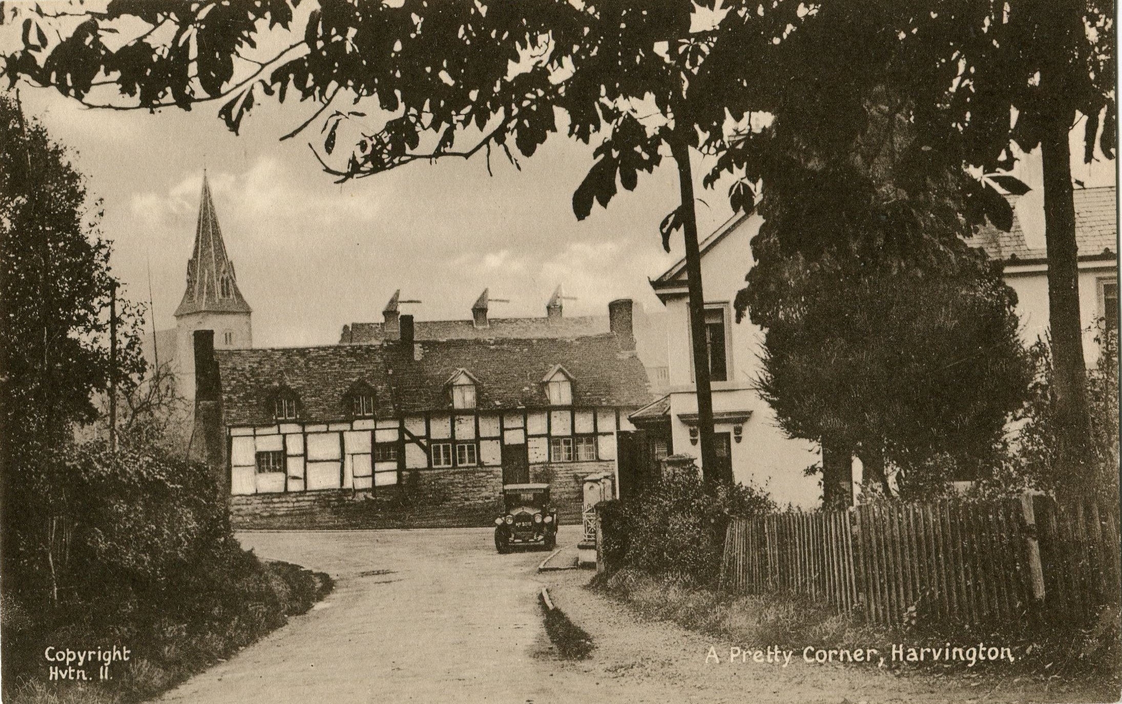 Postcard dated from the early 1930's. The card depicts the first two houses (Thatchways & Thatchholm) on the right upon entering Harvington from Norton. Note that Thatchways has its extension. The timbers on the end gable are now arranged differently.