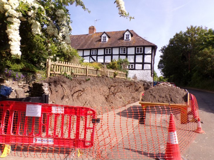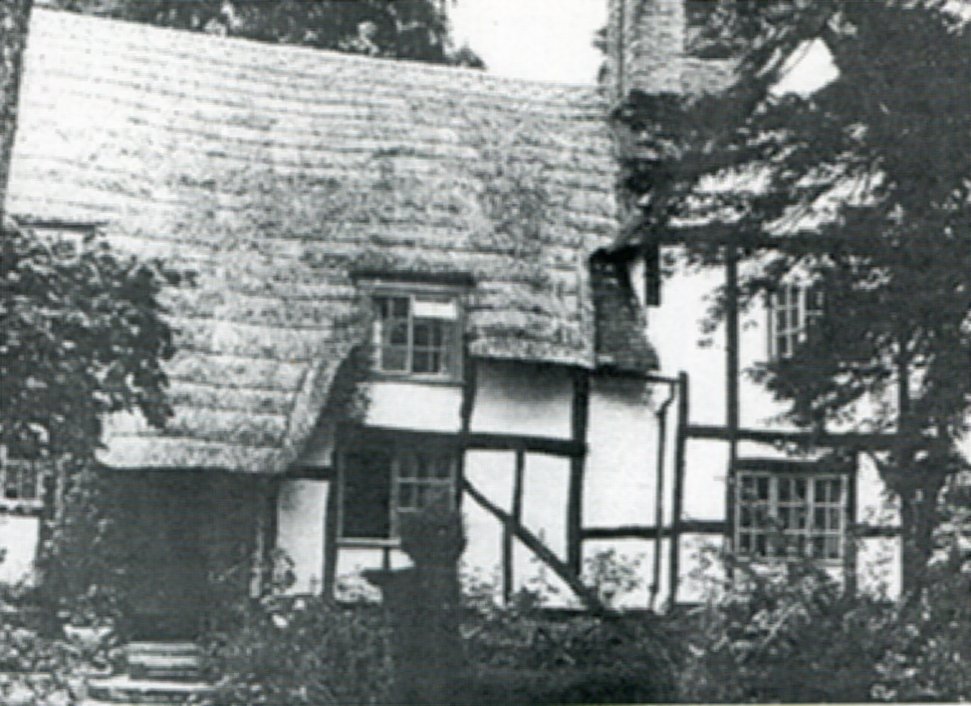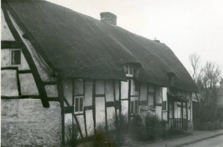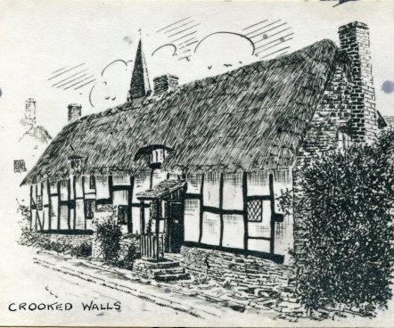 A lovely photograph dated to 1880 of Crooked Walls. This is at a time when it was four tenements facing south and not as now facing north. The lady standing at number two is Lucy Sorrel. Worcestershire Record Office.