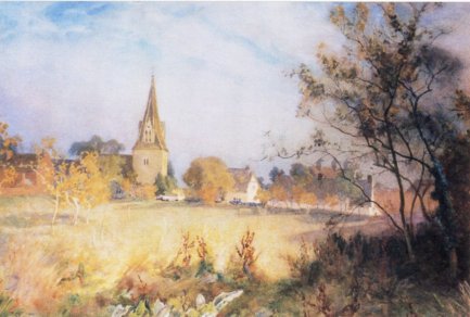 A fine painting by artist Peter Hemming of Durham, Peter grew up in Harvington.