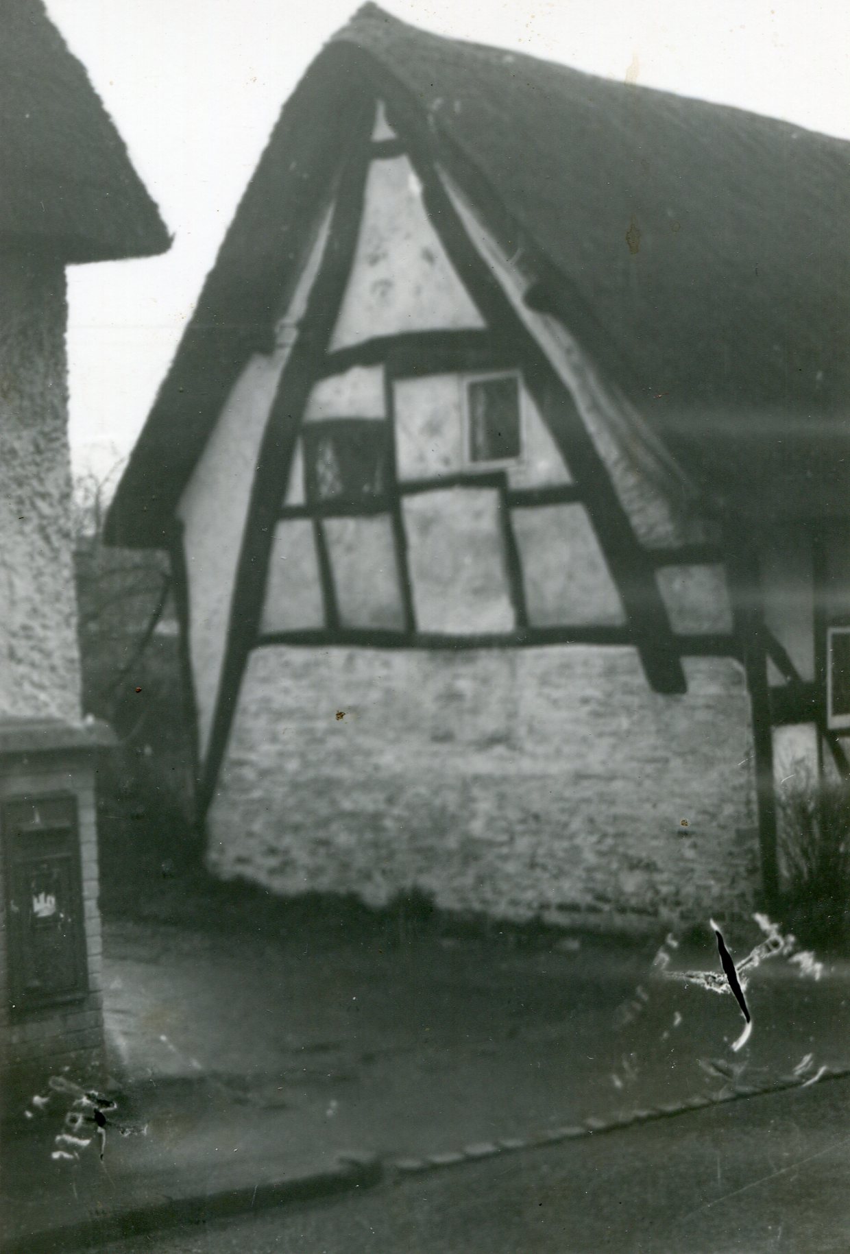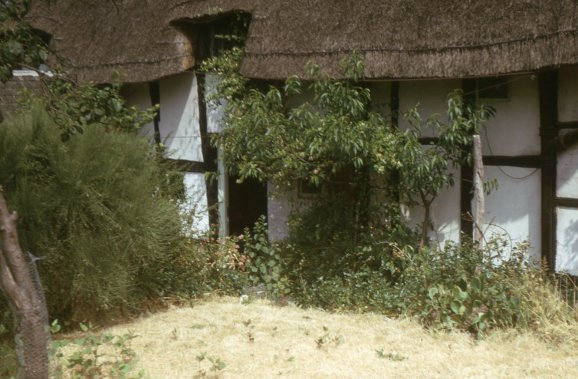 Photograph of James Cottage and Crooked Walls dated to 1975. Note the old windows of James Cottage and no little garden in front. Photograph by Ken Davies.