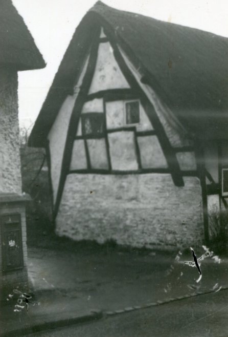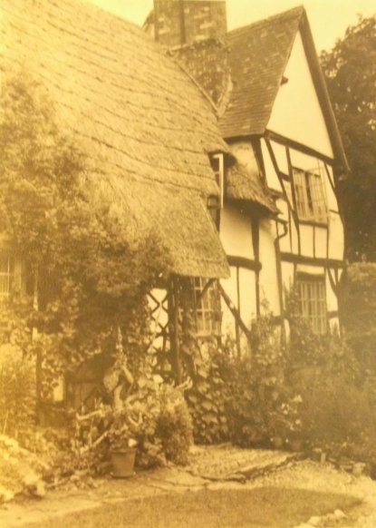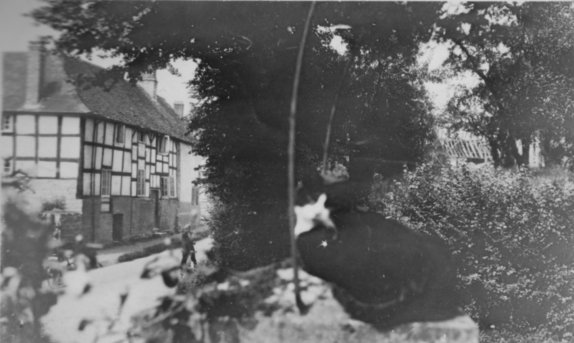A photograph of Bank Cottage and The Malt House from the front garden of the Limes in Shakespeare Lane. Note, apart from the cat (who looks remarkably like my late cat Merlin, Ed.), in the top right hand corner the unroofed remains of a timber framed barn adjacent to the Hop Kiln. From the Cook Family collection.