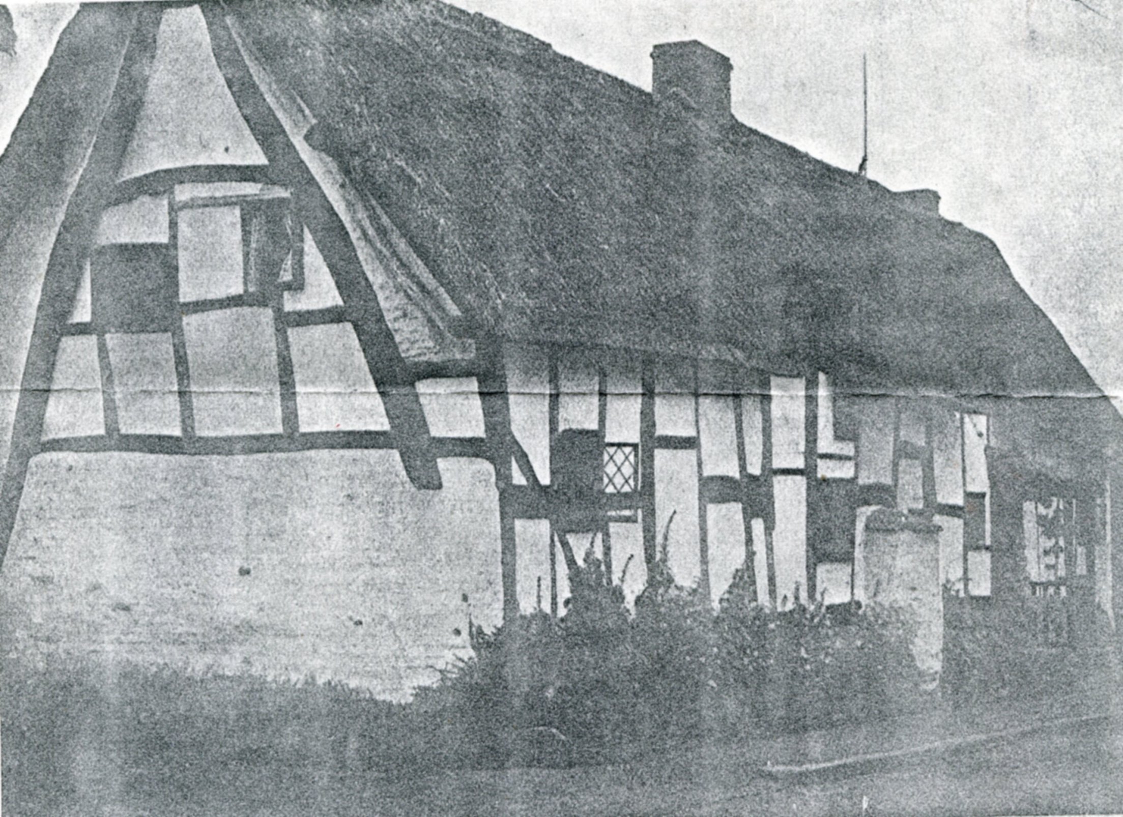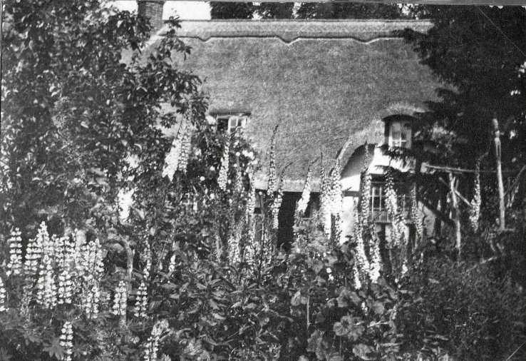 Photograph of Crooked Walls dating early 1950s. This new thatch was to last until about 2013. Note the end chimney was shortly to be removed.
