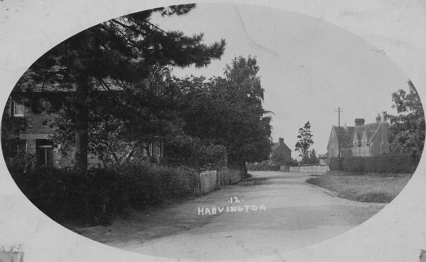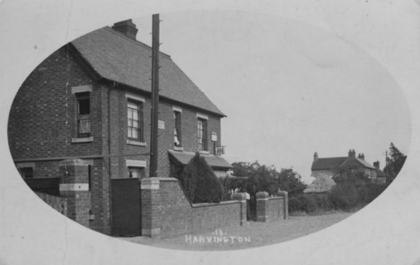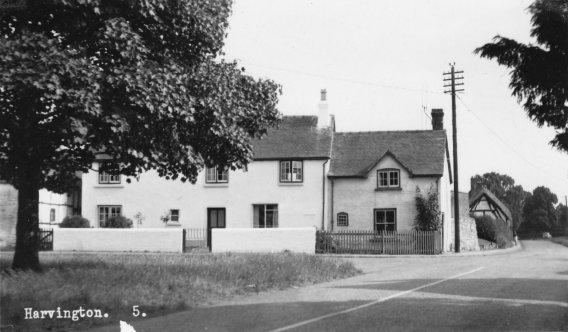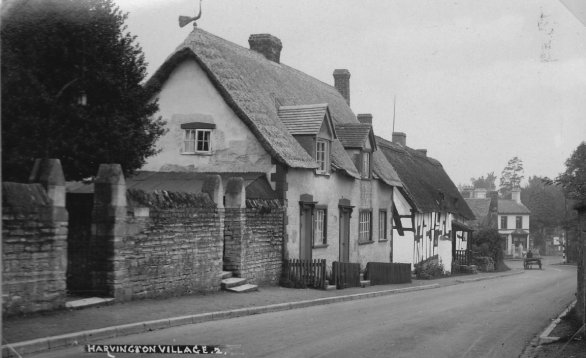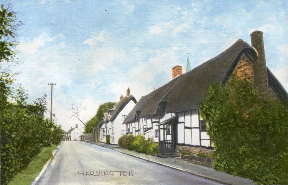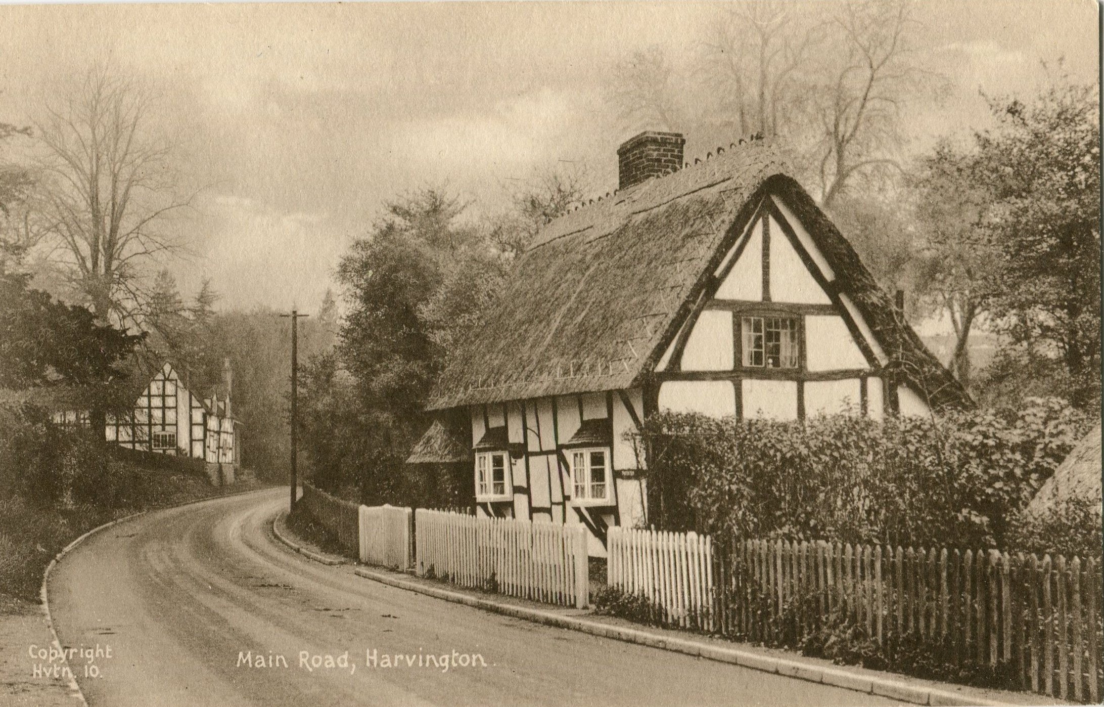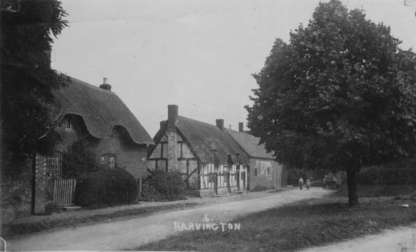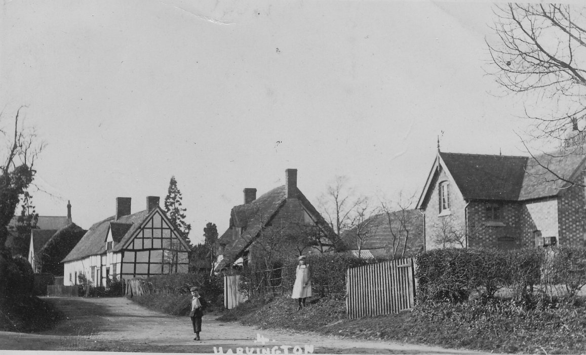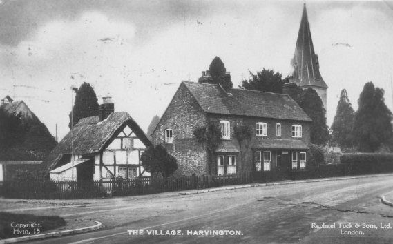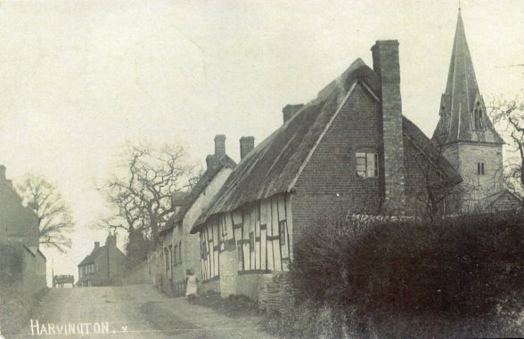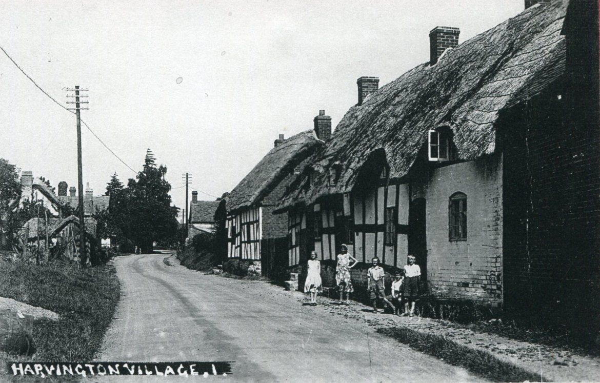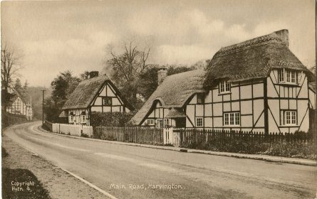 Postcard dated from circa 1925. The card depicts the first two houses (Thatchways & Thatchholm) on the right upon entering Harvington from Norton.