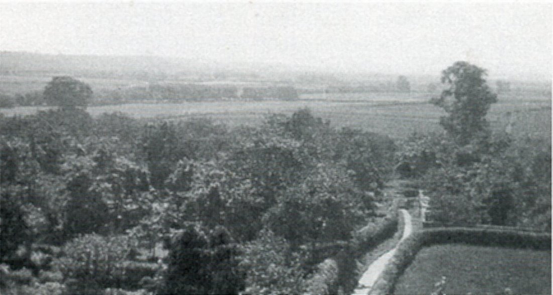 Photograph taken from the tower about 1985 looking down on Crooked Walls and the village beyond. Photograph taken by Steve Cook.