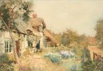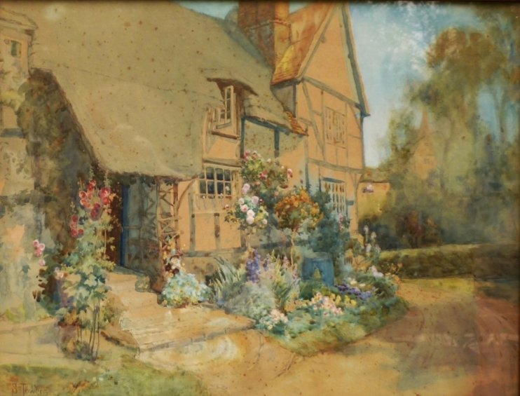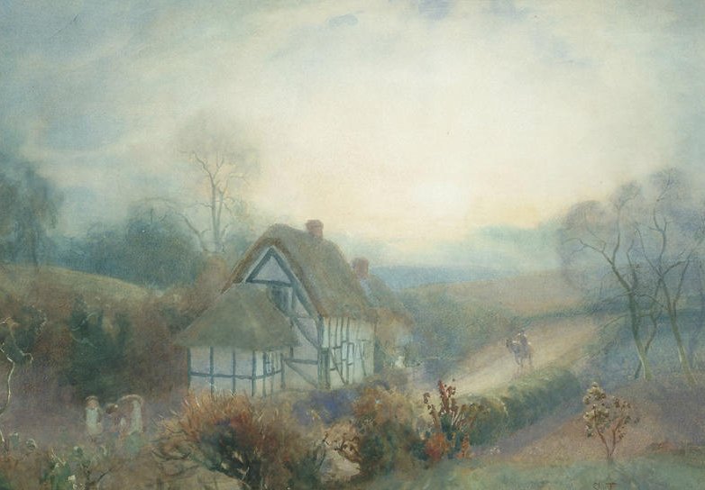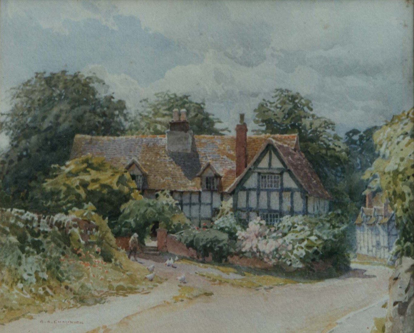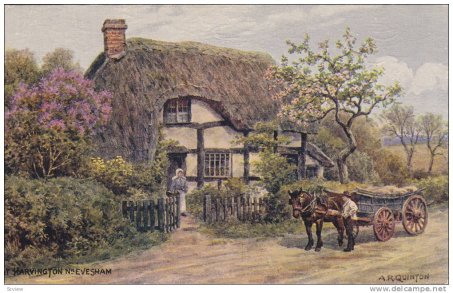 Painting of Thatchways by the artist A R Quinton, 1853-1934. He travelled the Country painting hundreds of scenes which he then produced as postcards.