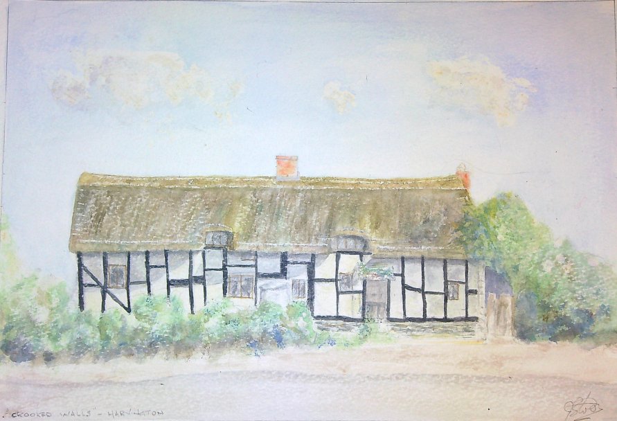 Painting of Crooked Walls signed by the artist but unreadable. The gentleman lived one of the houses in St James' Close and delighted in looking at Crooked Walls before it was obscured by the vegitation.
