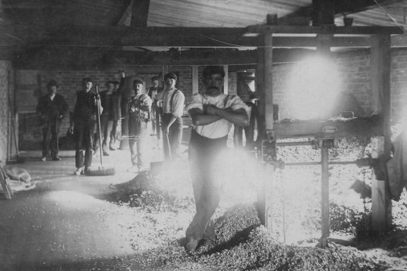 Photograph taken of workmen in the interior of the Hop Kiln. From the Cook Family collection.