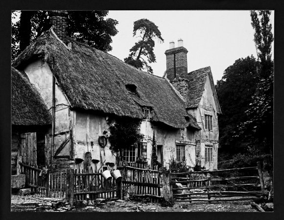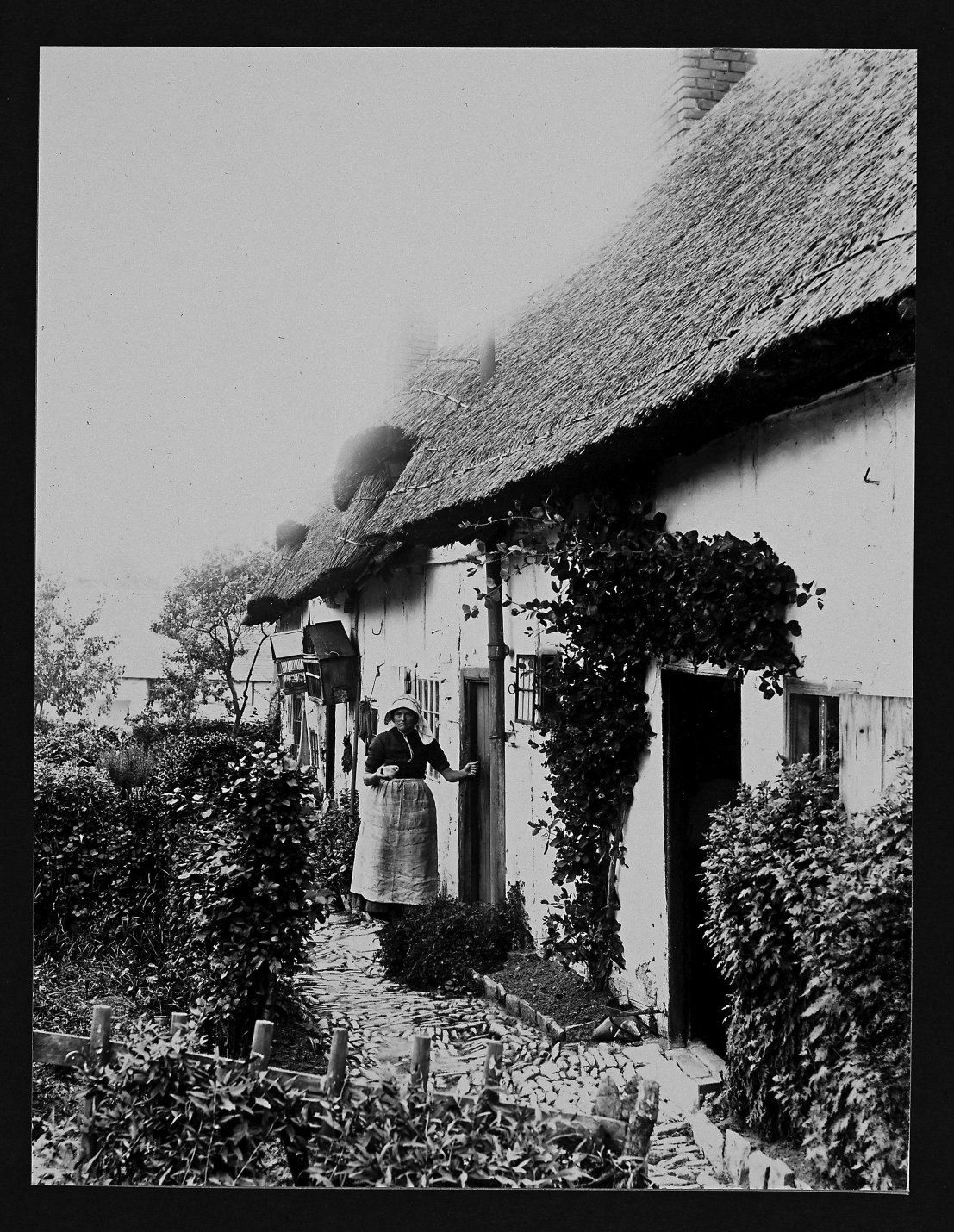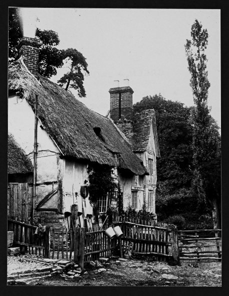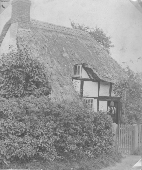 Photograph of Thatchways Cottage dated to 1900. Alongside the photograph is written: "Mr Cresswell at door, he was a hedger and ditcher and lived here with six children 1900". From Cook Family collection.