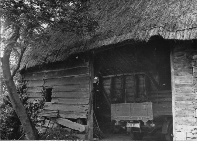 The only known full photograph of the old cider mill building although a faint image of it appears in the photograph taken from The Limes with the cat when only its bare roof timbers remaining. The mill was situated where No. one & two Hopkiln cottages now stand. Its age is not known but it does appear on the 1837 plan of Harvington as a large mostly rectangular building orientated east west. It was demolished circa 1935 to make way for the Hopkiln Council houses. Written beneath is: "1930's remains of Harvington Cider Mill". From the Cook Family collection.