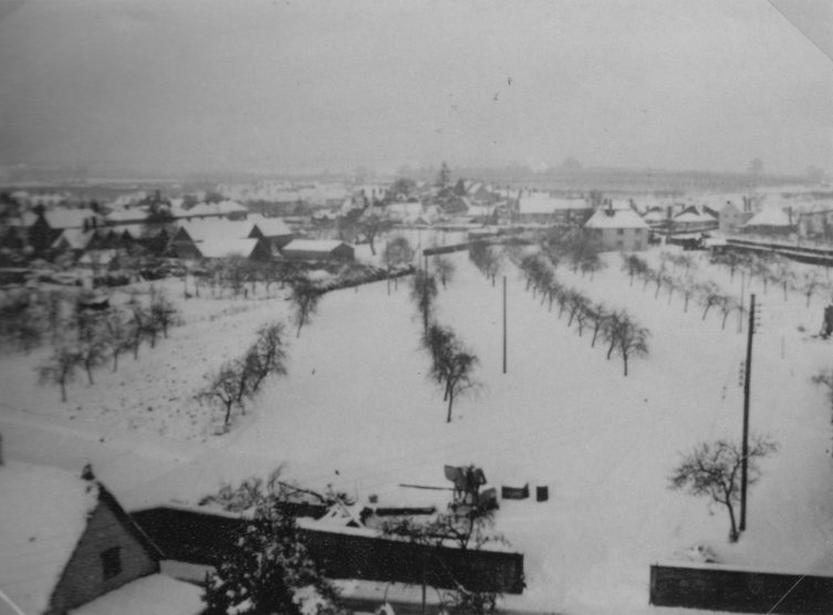 Photograph taken of a snowy Harvington from the church tower over what is now St James's Close. Written alongside is "Jan 3rd 1951 taken from church spire. The Close". From the Cook Family collection.