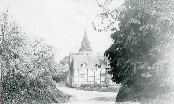Postcard taken from Station Road looking towards Candle Cottage with the properties called respectively Church Cottage and Church House to the right and the church behind. Postcards from the Cook Family collection.
