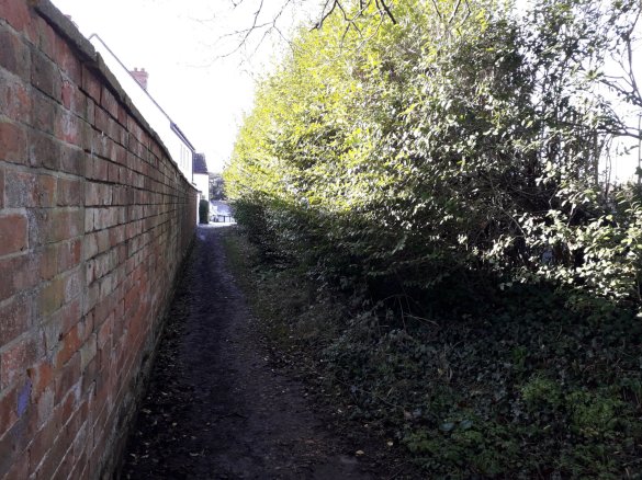 Photograph taken of the snicket alongside the old Shakespeare in 2020 just before the burialground hedge was trimmed back. Photograph by Julian Rawes.