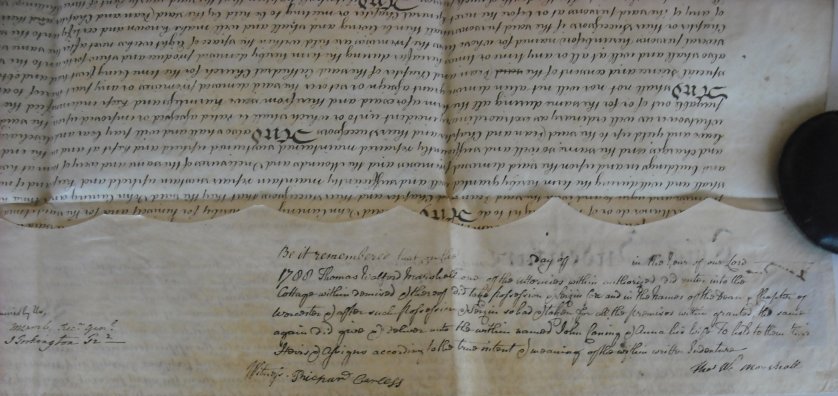 Here are two documents that appear to be part of a bundle that probably relate to the same property, note the old reference numbers which suggest a series of documents. The first dated 1782 (ref: 147202 1/2) and the second dated 1835 (ref: 147205 1/2). These were copied in the Worcestershire Record Office some years ago. The first is clearly concerned with the Canning family, while the second relates to a tenement involving Messeurs Marshall and Carless. Unfortunately the property or properties have not been identified. On the deeds of Crooked Walls, however, the name 'Careless' is written on the adjacent lane. Another pointer is a messuage identified as the Steps against which 'Careless' is recorded in the deeds of the Grange/Bank House.