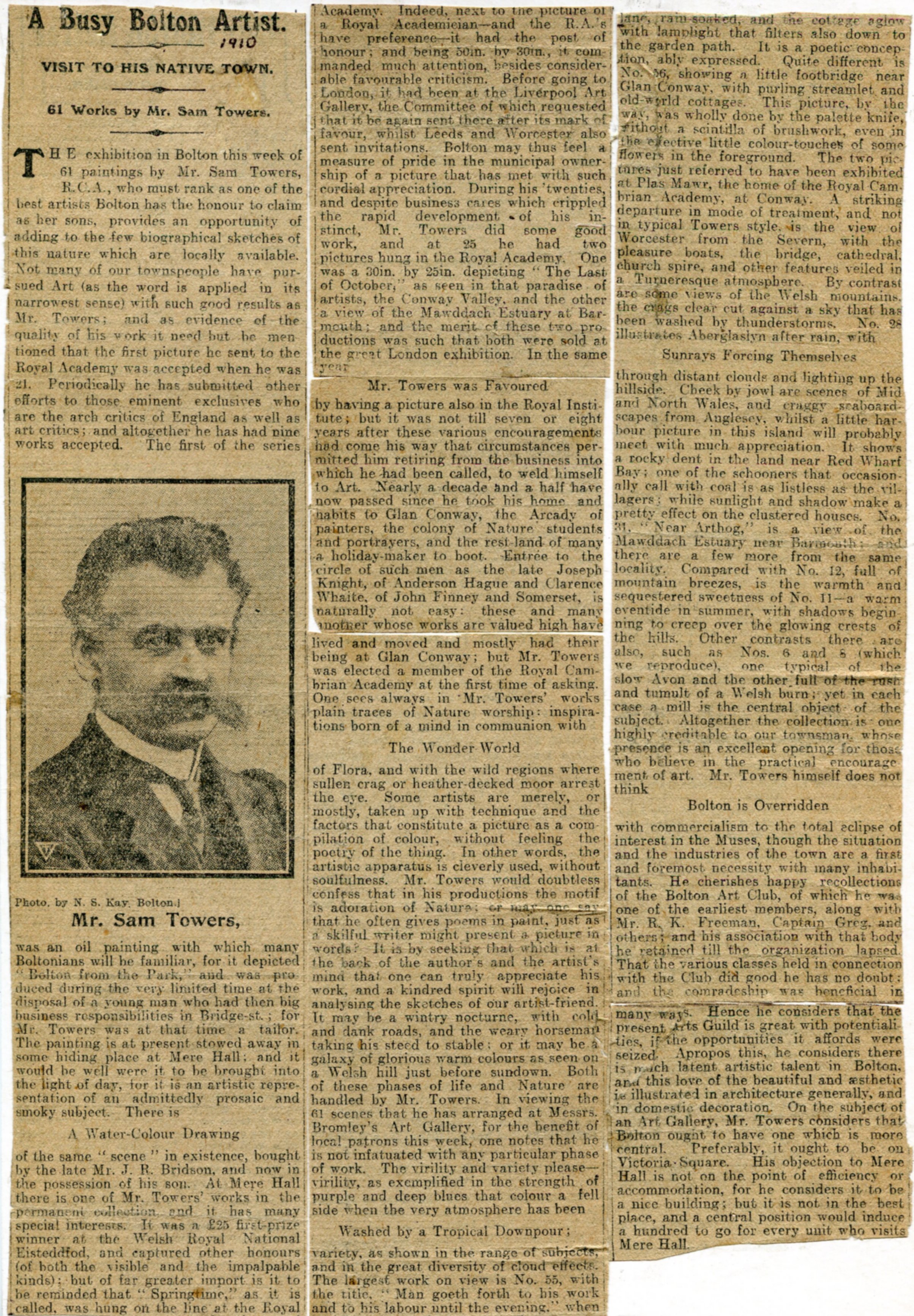 A Bolton friend and prominent patron writes:) I have known Sam Towers upwards of 60 years and so can speak with authority of his great ability as an artist. He was devoted to his art, and even in the summer holidays of his younger days, subjects for his brush were his first consideration. In many directions he was a student and a thinker, holding views and strong opinions of his own from which no arguement would move him. While he had of necessity to sell the products of his brush, he was often loth to do so. I myself have thought had he been blessed with even a little more of a commercial mind and pushful nature, he could easily have reached an eminence in the world of art, even beyond that attained with the Royal Cambrian Academy, of which he was so worthy a member. For many, Sam Towers will live long in the treasured works that he leaves. (W. Whitehead)